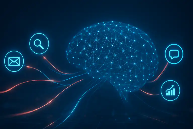 AI-based digital marketing solutions visualized as a glowing neural network connecting multiple marketing channels
