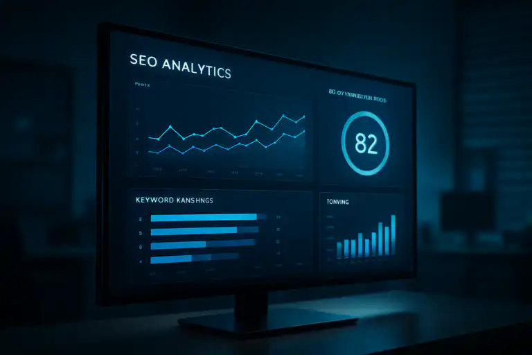 AI SEO software dashboard displaying keyword rankings and optimization scores on a monitor