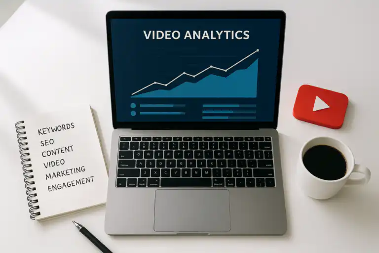 YouTube SEO optimization for creators showing analytics dashboard and keyword research notes on a desk